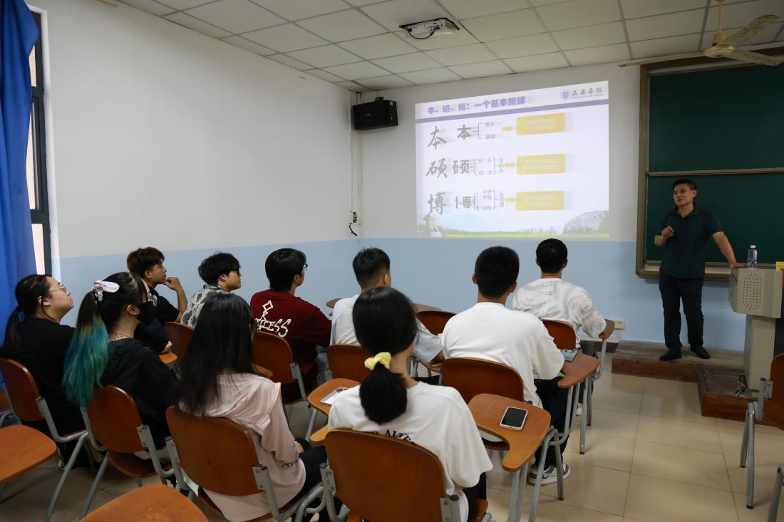 聂老师详细阐述了本科、硕士、博士三个阶段的区别与联系,生动解析了“本”字的构成:“木”上加“一”,后加的“一”代表根基,形象说明了本科教育是学术研究的基础和根本。谈到专业硕士与学术硕士时,他强调二者“殊途同归,不分优劣”,但指出专硕不能学硕化,要更注重实践能力培养,并叮嘱同学们多与行业导师联系交流。