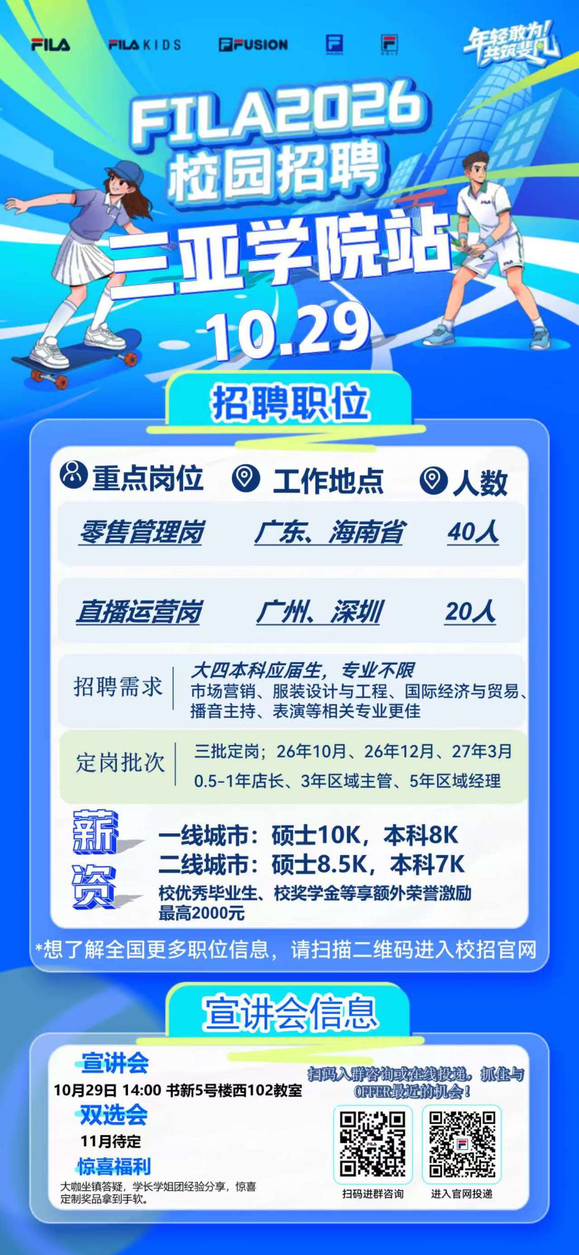 【校园专场招聘会】10月29日,FILA2026校园招聘三亚学院站,诚邀2026届毕业生参加!