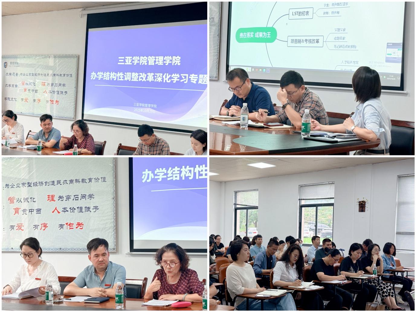10月29日下午,三亚学院管理学院组织召开办学结构性调整改革深化学习专题会。会议以“再学习、再聚焦、再出发”为核心目标,集中学习李书福董事长在2025级新生开学典礼上的讲话视频,以及《理事长在吉利院校会议上的讲话学习稿件》《校长在2025级新生开学典礼上的讲话学习稿件》《三亚学院督查工作专题会议纪要》《三亚学院专项工作会议纪要》《USY办学结构性调整改革总体方案》等核心文件。学院院长王云凤教授主持会议,全体教职员工全员参会,学校相关职能部门领导受邀出席并指导会议。