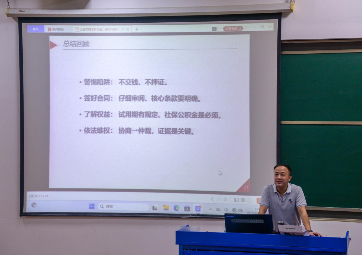 为切实提升2026届毕业生求职风险防范能力与权益保护意识,10月25日9:30,在书德楼108,海南省职业导师、海南自由贸易港高层次人才商旭老师为三亚学院2026届毕业生们开展了一场以“权益保障”为主题的“一对一”职业指导讲座。管理学院90余名2026届毕业生积极参与,现场气氛热烈,活动效果良好。