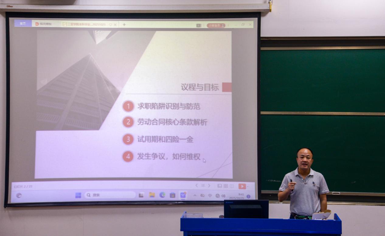 讲座开篇,商老师直击当前就业市场痛点,结合多起真实案例剖析求职风险。如针对“猫猫贷”“培训贷”等求职相关借贷陷阱,详细还原某毕业生因“入职需先办理培训贷”陷入高额债务的案例,警示学生警惕此类以“预付费用”为名的金融骗局。同时,他将常见求职陷阱拆解为三类:一是收费陷阱,如虚假中介收取“岗位介绍费”“预留费”后失联;二是虚假信息陷阱,部分企业伪造资质、夸大薪资(如宣称“应届生月薪过万”却无实际保障);三是侵权陷阱,包括强制扣押身份证、要求“无偿实习3个月”不签协议等,让学生直观认清风险本质。