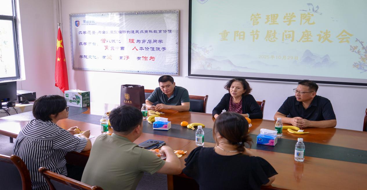 金秋送爽,丹桂飘香,岁岁重阳,今又重阳。10月29日上午10时30分,社科楼206会议室暖意氤氲,笑语盈盈,管理学院“情暖重阳”主题慰问座谈会在此温情启幕。学院院长王云凤、党总支副书记陶信伟与聂英、罗斌等退休返聘老教授围坐一堂,共话桑榆情,同抒赤子心,让这个满载敬意的节日格外温馨。