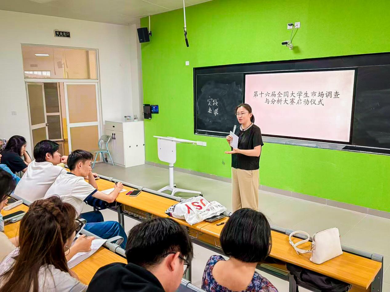 启动仪式由杨雅恬老师主持,她首先对到场师生表示热烈欢迎,并结合赛事发展历程强调了大赛的育人价值。她提到,市场调查能力是新时代大学生的核心竞争力之一,希望同学们以本次大赛为契机,将理论知识转化为实践动能,做到真题真做、精益求精。杨老师的话语为参赛学子注入信心。随后,她系统梳理了校赛报名、个人网考、团队组建、作品提交等关键流程,重点明确了个人网考合格是组队参赛的前置条件,并细致提醒同学们密切关注赛事通知群,按时完成费用缴纳与信息备注等事宜,确保赛事各环节无缝衔接。