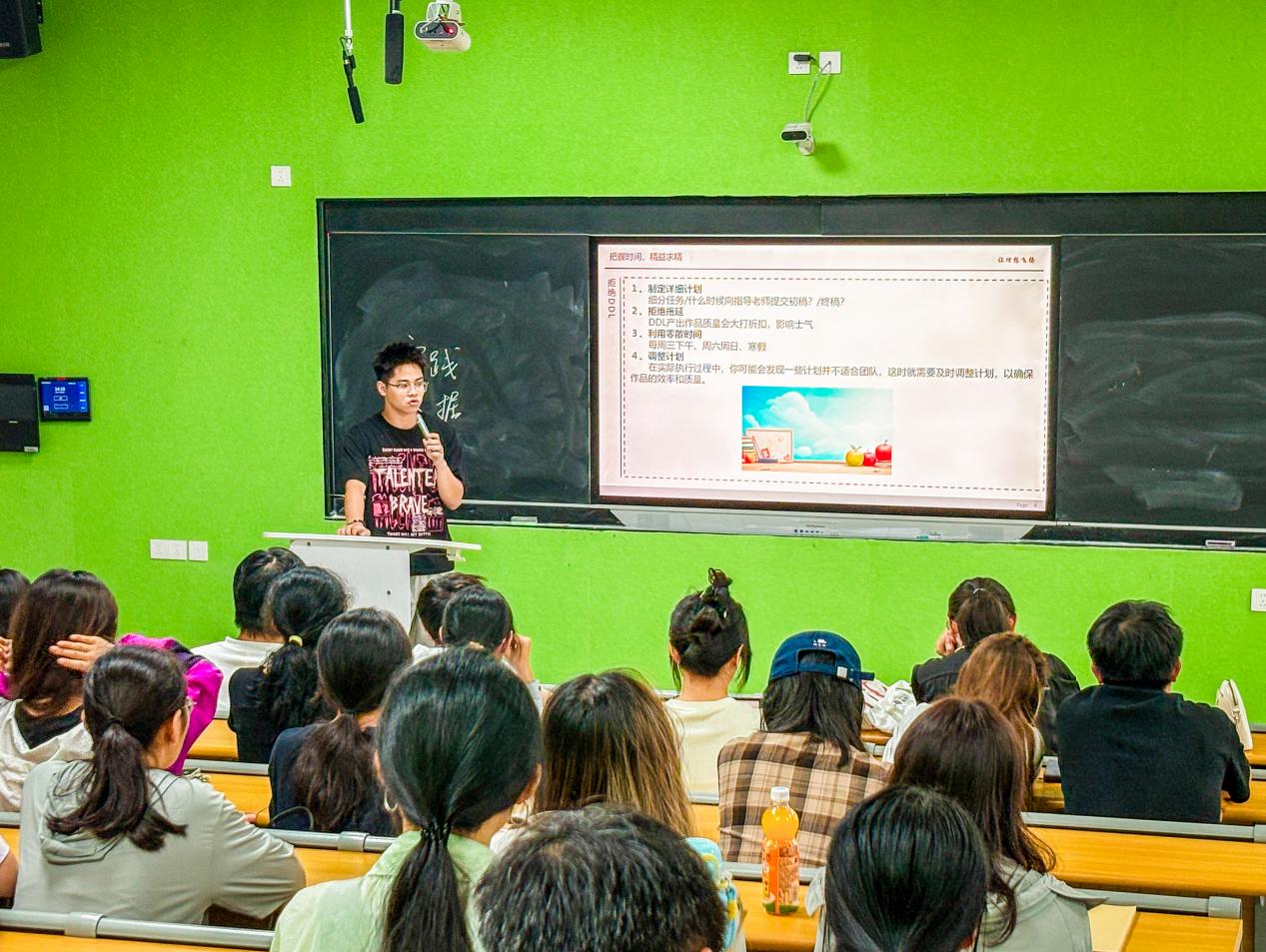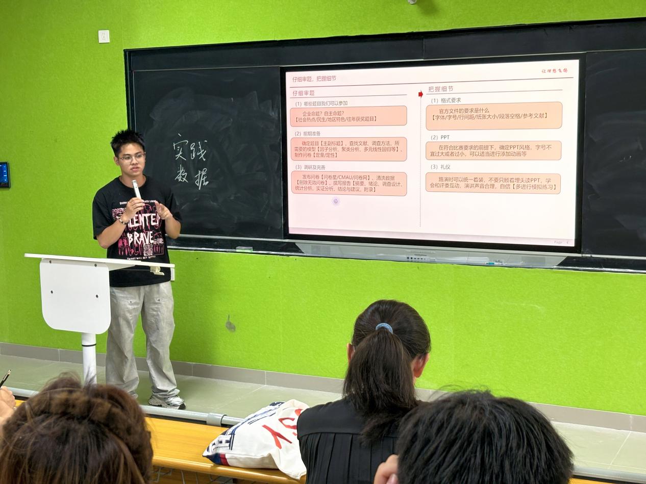 在组队与资源利用环节,往届获奖代表陈杰同学结合自身经历分享实用建议。他重点推荐跨学科组队模式,认为人文社科学生的洞察能力与理工科学生的数据优势结合,能打造更具竞争力的团队。同时,他建议同学们主动对接学院资源,多向管理学院、社会学院教师及学长学姐请教,高效备赛。