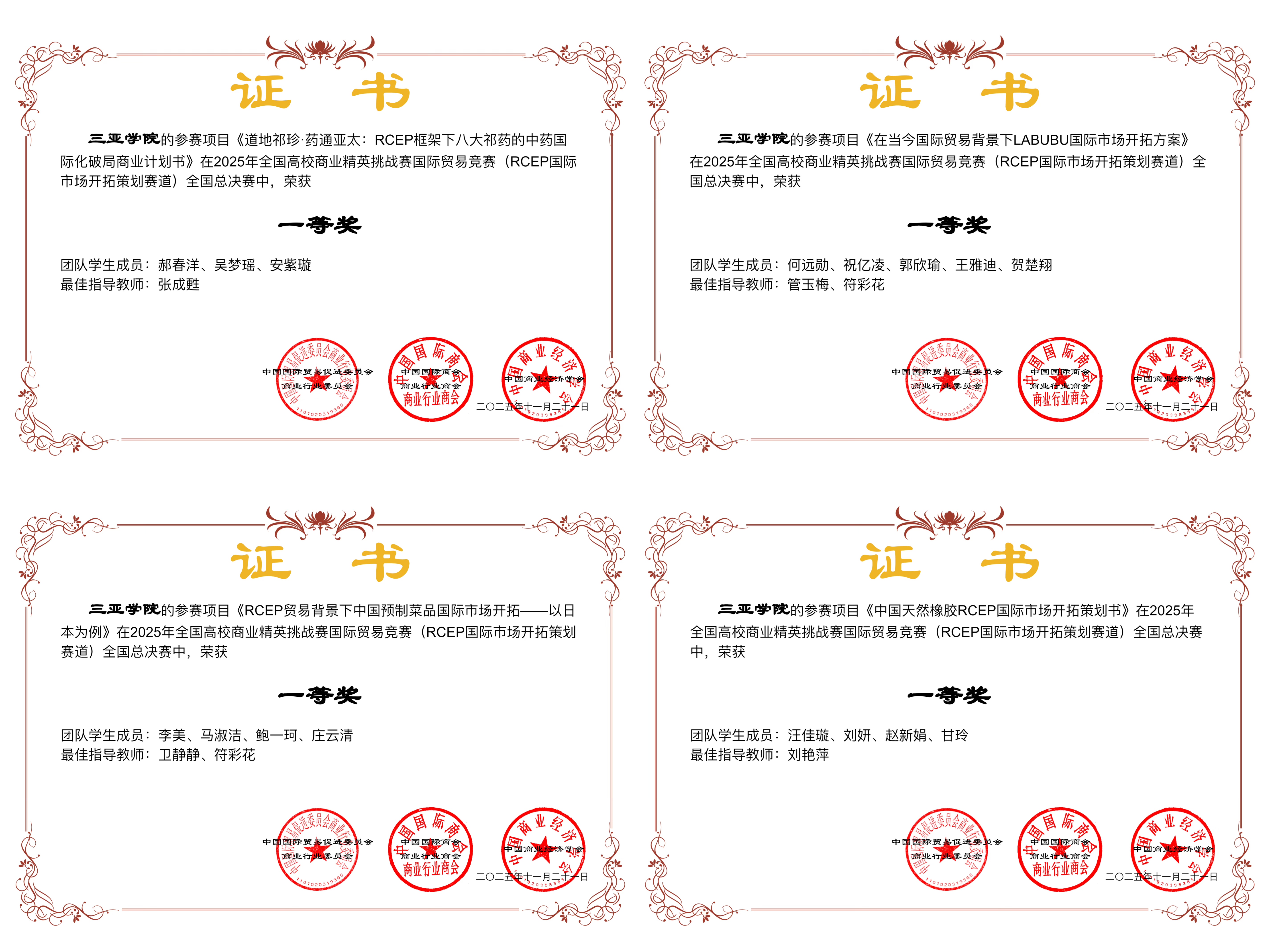 其中,RCEP国际市场开拓策划赛道的“MKT菁英队”“蛋仔派对队”“橡胶超人队”等获奖团队,凭借对海南特色产业与RCEP市场的深度结合策划,成为赛事中的亮眼焦点;国际贸易与商务专题赛道的一等奖团队则以对跨境电商新业态的独到见解,获得评委一致好评。与此同时,管理学院张成甦、管玉梅、卫静静、王新爱、宋志章、刘艳萍、杨雅恬、罗灿、黄蕊、符彩花、李怡蒙等指导教师因突出的指导成效,荣获“最佳指导教师奖”。