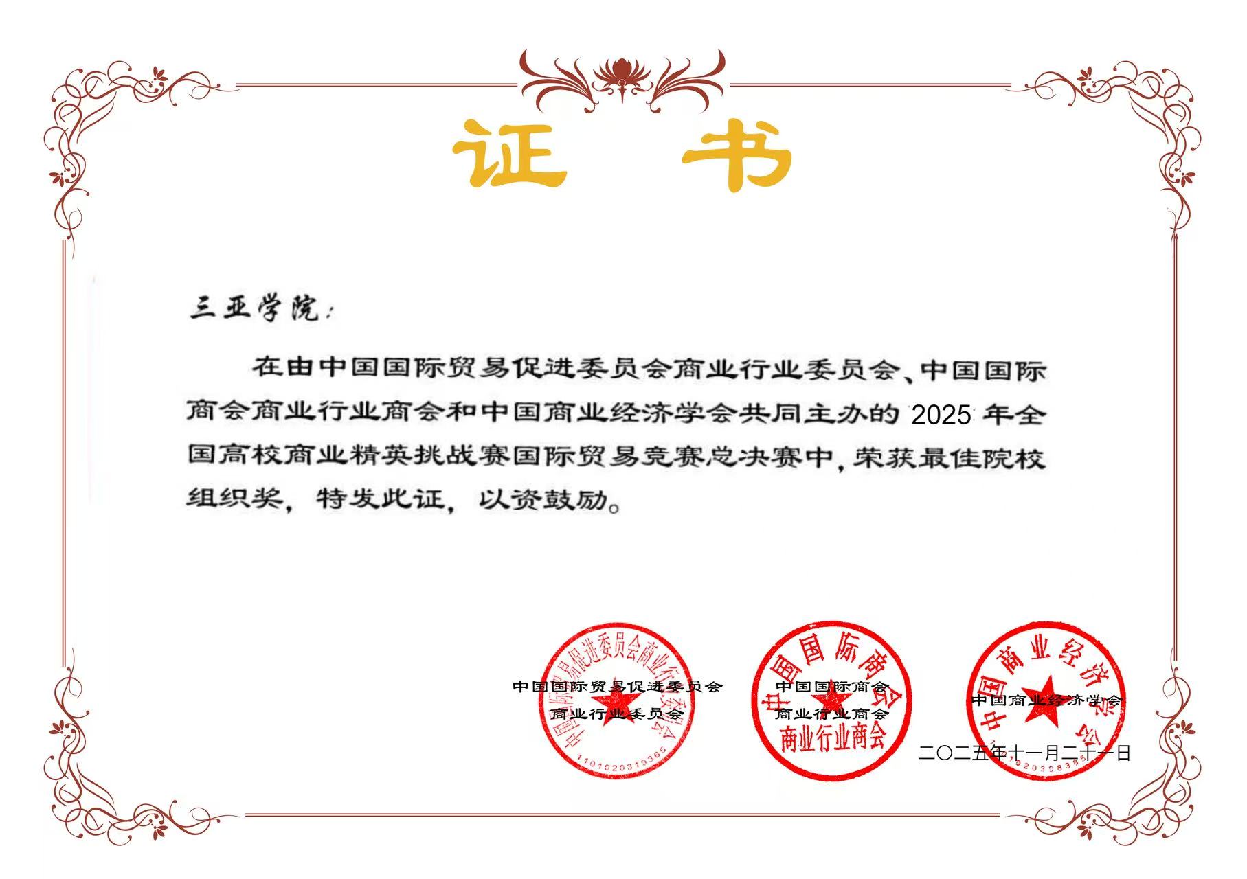近日,2025年全国高校商业精英挑战赛国际贸易竞赛全国总决赛落下帷幕,三亚学院管理学院参赛团队凭借扎实的专业功底、创新的策划思维与出色的实战能力脱颖而出,一举斩获全国性奖项11项,其中全国一等奖5项、二等奖3项,三等奖3项,同时荣获最佳院校组织奖,创下学院在该赛事中的历史最佳战绩,为学校赢得了荣誉。