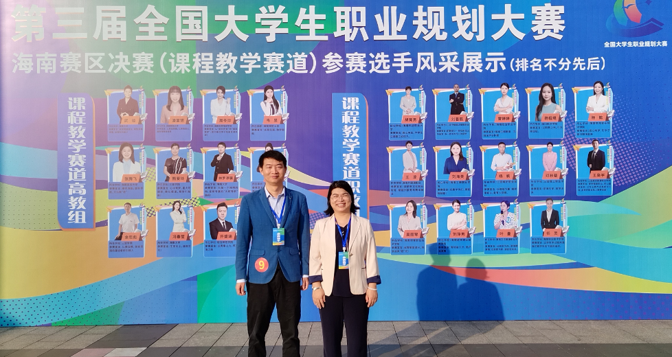 熊爱玲老师(右)、余忠彪老师(左)在第三届全国大学生职业规划大赛课程教学赛道海南赛区选拔赛赛场合影