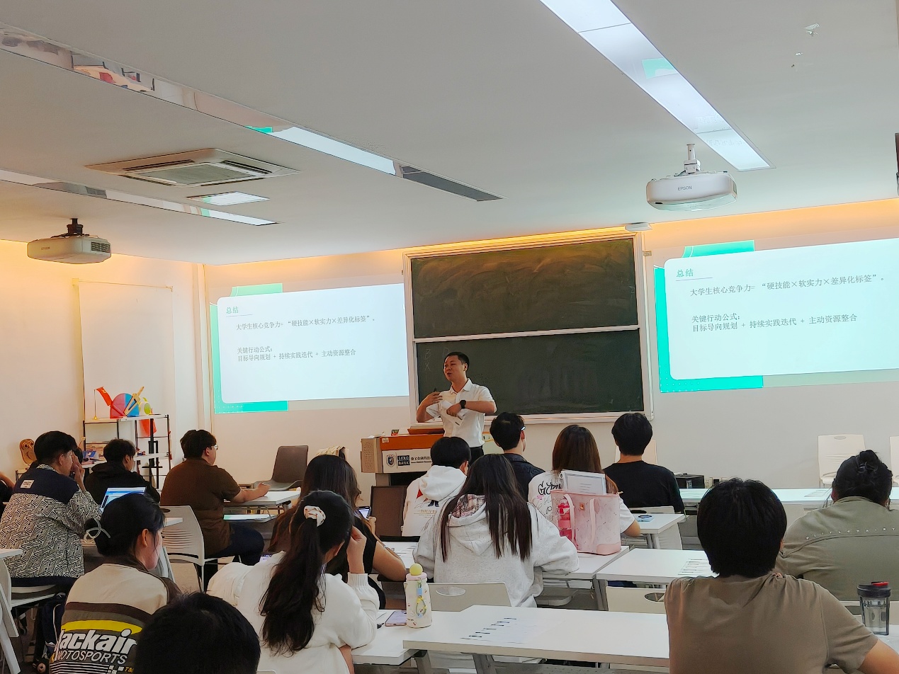 本次课程紧扣大学生职业发展核心需求,以核心能力提升为切入点,明确三大培养方向。其一,筑牢扎实专业能力,夯实就业创业硬技能根基,引导学生深耕专业领域,掌握安身立命的“看家本领”;其二,锤炼职业素养软实力,聚焦实践操作与问题解决能力培养,助力学生适应职场多元挑战;其三,深化综合职业素养,推动学生实现从“校园人”到 “职场人”的思维转变,构建全方位竞争力。课程中,讲师还拆解了分阶段能力提升行动方案,梳理能力培养常见误区,并凝练出“大学核心竞争力= 硬技能×软实力×差异化标签”的成长公式,为学子成长成才提供清晰指引。