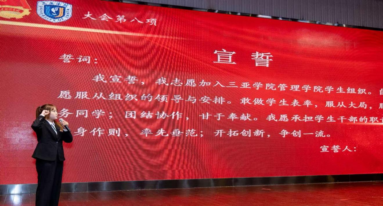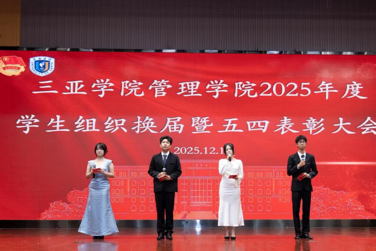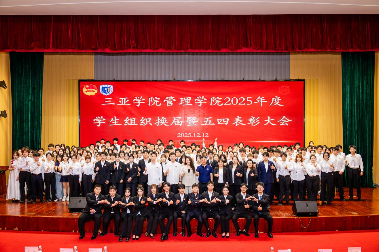 青春如歌,传唱使命传承;旗帜所向,凝聚奋斗力量。12 月 12 日,三亚学院管理学院 2025 年度学生组织换届暨五四表彰大会在庄重热烈的氛围中拉开帷幕。本次大会深度契合学院 “以学生为中心”“千人千面” 的育人理念与培养目标,通过总结过往成就、表彰先进典型、完成组织交接三大核心环节,既彰显了全院学子昂扬向上的精神风貌,更凝聚了接续奋斗的青春共识。管理学院党总支副书记陶信伟老师、团委副书记王娜老师及各年级思想导师出席大会,学院各学生组织骨干、班干部代表共同见证这一重要时刻。