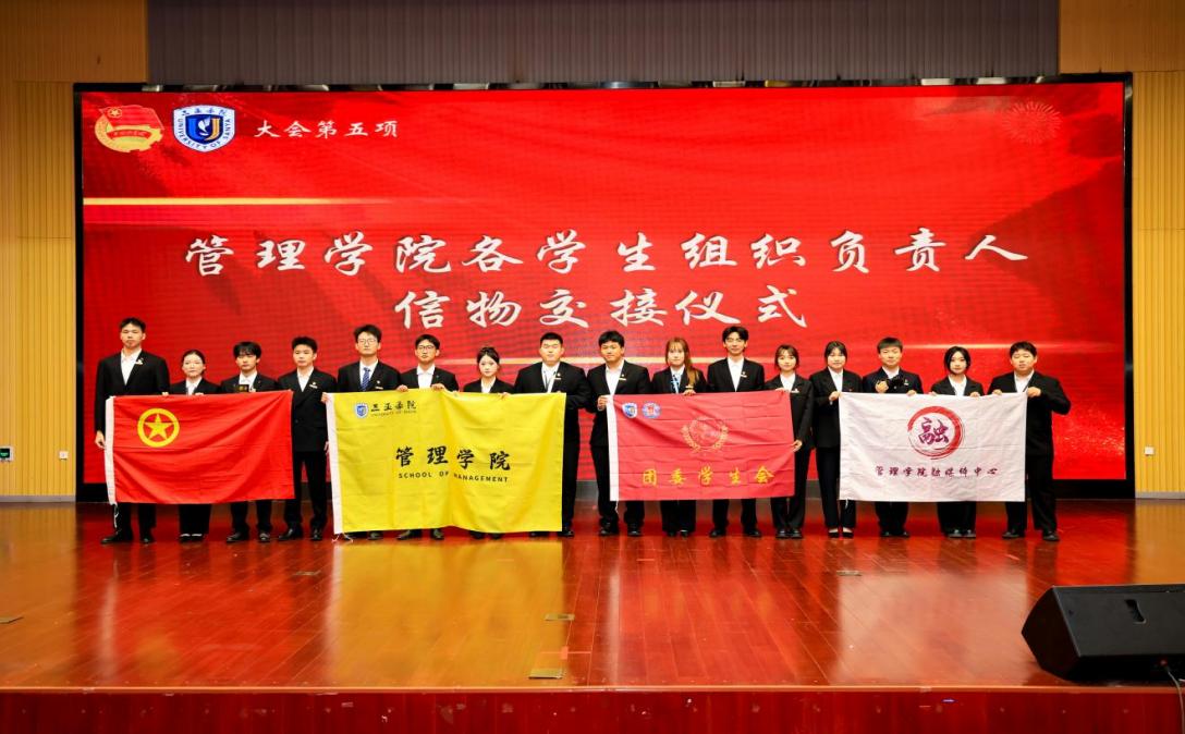 最令人动容的环节当数旗帜与信物交接仪式。第十六届学生组织负责人手持象征使命的旗帜与代表性信物,郑重交予第十七届继任者手中。这一庄重瞬间,标志着管理学院学生工作正式完成新老交替,更延续了 “全心全意为同学服务” 的精神血脉。
