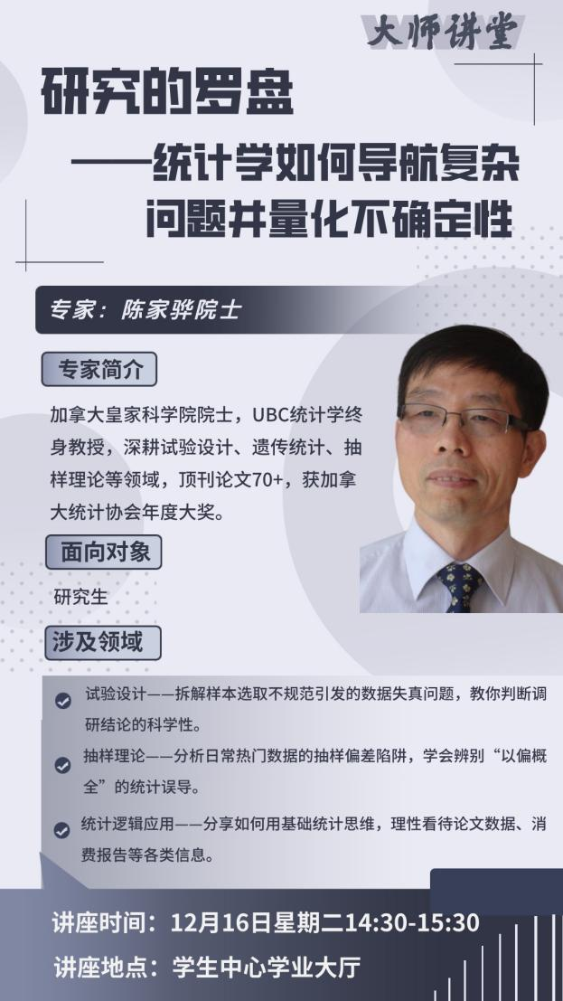 简介陈家骅教授,加拿大皇家学会(RSC)院士,加拿大一级讲座教授(统计学),现任英属哥伦比亚大学统计学系教授。他在统计方法学方面做出了重要贡献,包括将经验似然引入抽样调查,发明有限混合模型的 EM 检验,以及提出适用于大模型空间的扩展贝叶斯信准则 (EBIC)。他是数理统计学会(IMS)和美国统计学会(ASA)院士,并荣获加拿大统计学会(SSC)最高奖章、CRM-SSC统计学奖和国际华人统计学会杰出成就奖等重要荣誉。