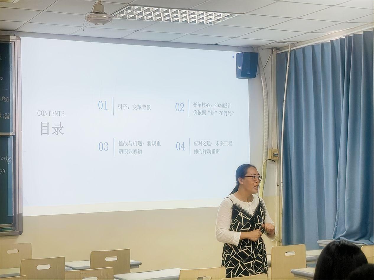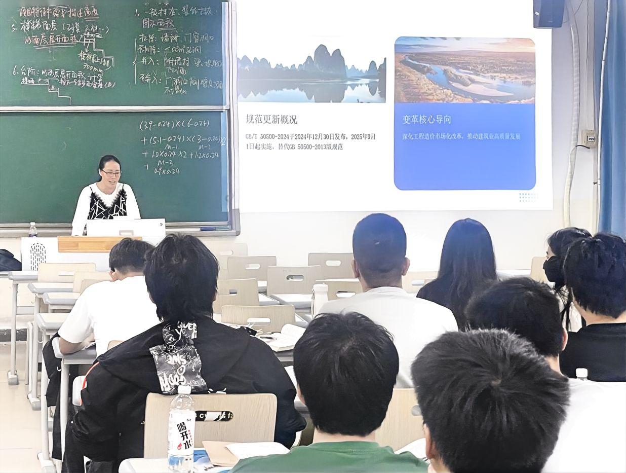 讲座最后,蒋必凤老师勉励同学们主动学习新版计价标准,紧跟行业发展步伐,不断提升专业适配能力,以应对未来职业挑战。此次讲座紧扣行业前沿动态,内容详实、针对性强,不仅帮助同学们厘清了新标准的核心变革,更为其毕业后从事造价相关工作筑牢了专业基础。