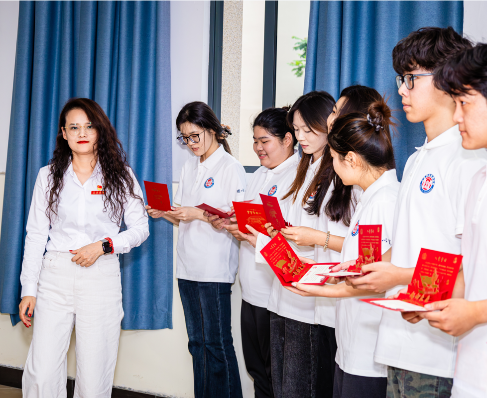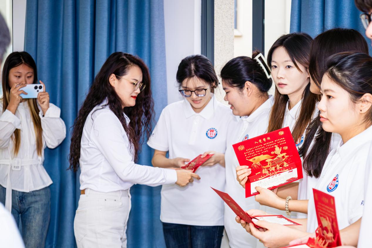 仪式感满格的“政治生日”寄语环节,将大会氛围推向高潮。党总支副书记陶信伟老师、团委副书记王娜老师代表管理学院党总支和学生党支部,为新转正党员逐一送上精心制作的政治生日贺卡。贺卡上,既有党组织对党员的深切关怀,更有“不忘初心跟党走,砥砺奋进建新功”的殷切寄语,让每一位新党员在庄重的仪式中深刻感受到党员身份的荣誉感、责任感与使命感。