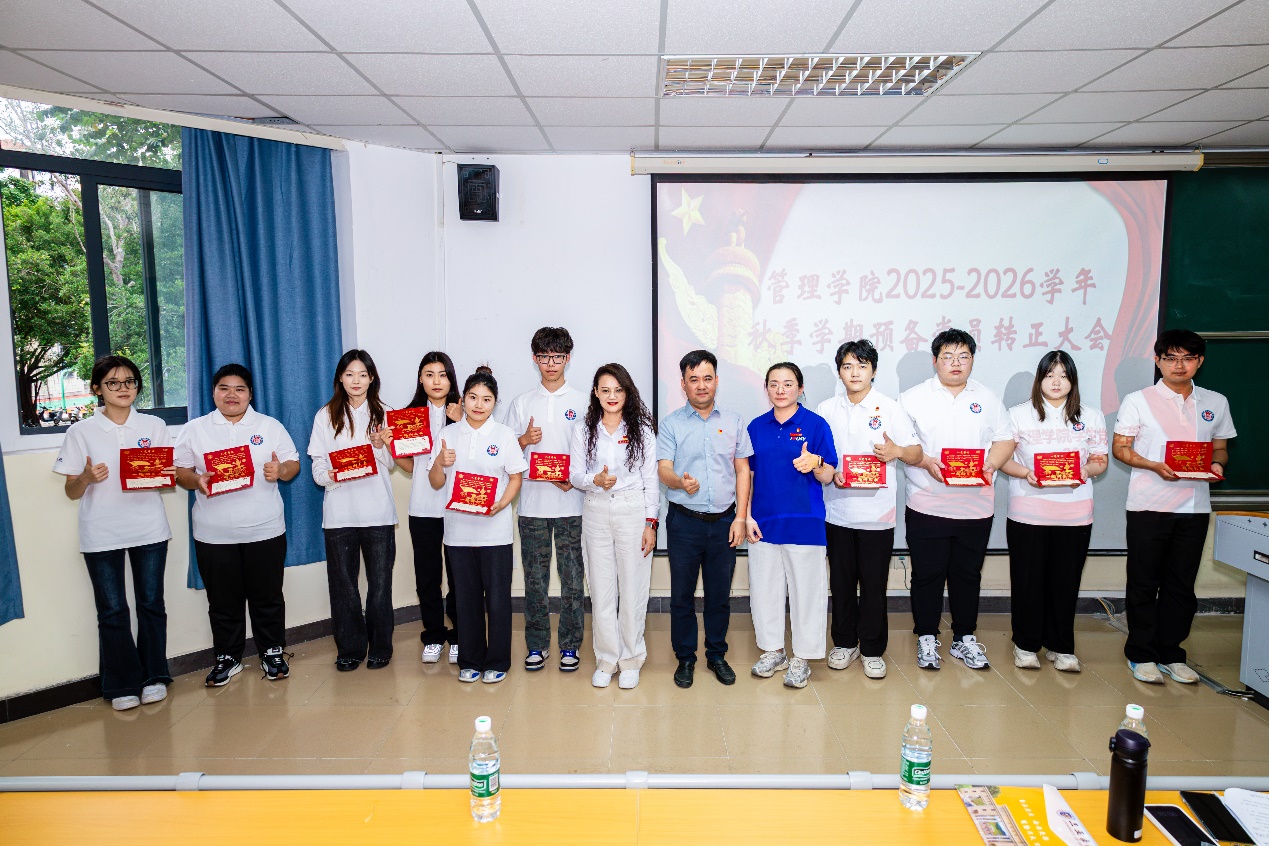 为扎实推进党建思政育人工作,强化党员队伍建设,筑牢青年学生理想信念之基,11月30日,三亚学院管理学院学生党支部在5东307教室隆重举行预备党员转正大会。经过一年考察期的淬炼与成长,10名预备党员顺利转为正式党员。会议由学生党支部组织委员高雯晶老师主持,学院党总支副书记陶信伟老师,团委副书记王娜老师出席会议,全体党员、入党积极分子共同参会。