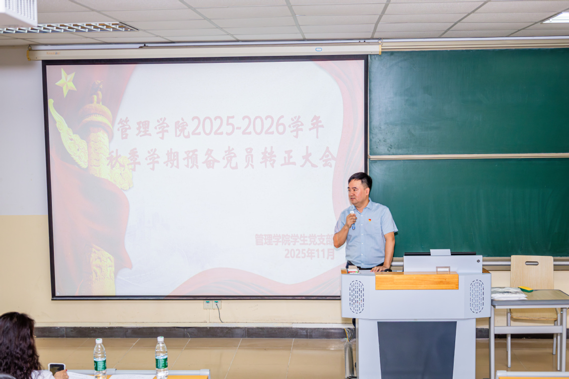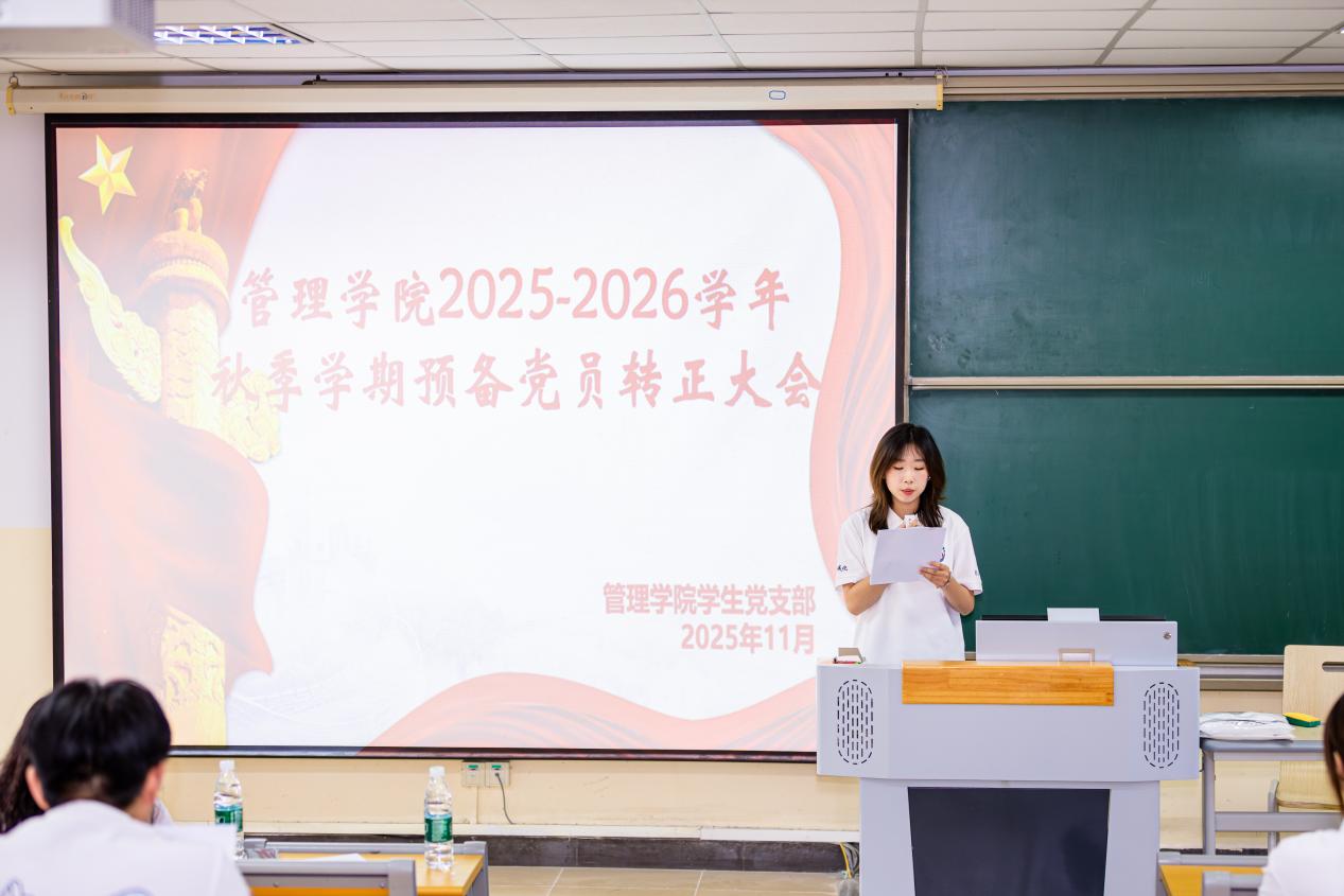 此次预备党员转正大会,既是一次严格规范的党组织生活,更是一堂深刻生动的思政教育课。通过庄重的仪式感与思想引领,进一步强化了党支部的组织力、凝聚力与战斗力,不仅为管理学院学生党支部注入了新鲜血液,更激励着全体党员、入党积极分子以新党员为榜样,不忘初心、牢记使命,以更加饱满的热情、更加务实的作风投入到学习、工作与服务中,持续推动学院党建思政育人工作走深走实,为培养担当民族复兴大任的时代新人筑牢根基。