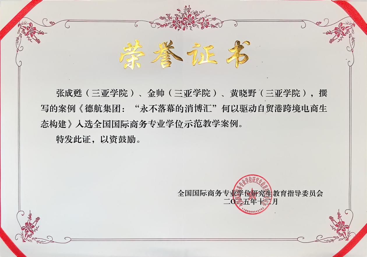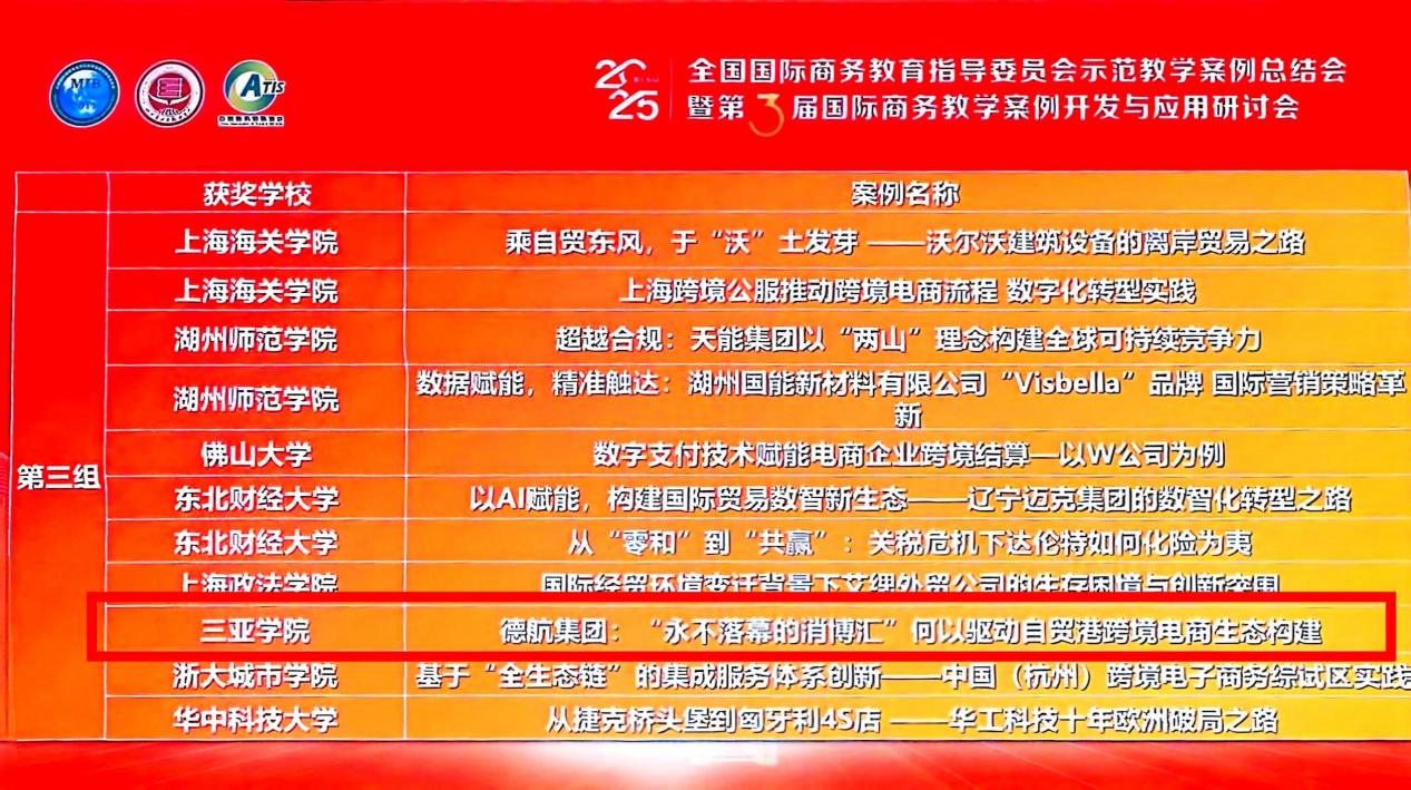 会上,2025年度全国国际商务专业学位研究生教育指导委员会示范教学案例评选结果揭晓,由张成甦老师团队撰写的案例《“永不落幕的消博汇”何以驱动自贸港跨境电商生态构建》成功入选,成为我校自获批国际商务硕士专业学位授权点以来,首个入选全国MIB案例库的案例,也是2025年海南省高校入选的唯一案例,这是我校在国际商务专业硕士研究生培养方面取得的又一高质量成果。