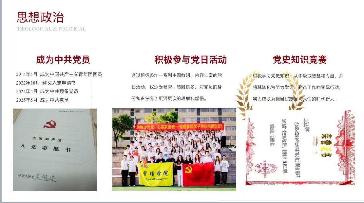 思想上,应佩峻始终以高标准严格要求自己,积极向党组织靠拢,主动学习党的创新理论,树立了正确的世界观、人生观、价值观。他认为,当代大学生不仅要练就过硬本领,更要涵养家国情怀,“只有将个人理想融入时代发展,才能让青春更有分量。”面对学弟学妹,应佩峻送上了真诚的建议:“大学是沉淀自我的黄金时期,既不要急于求成,也不能虚度光阴。希望大家能认真对待每一门课程,珍惜每一次实践机会,在学习中积累,在探索中成长。同时,要学会接纳不完美,允许自己有试错的空间,慢慢找到属于自己的节奏,最终成为更优秀的自己。”
