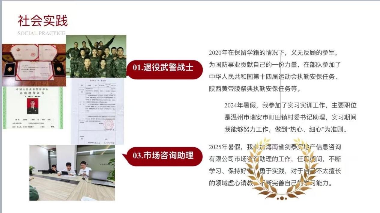 在社会实践与综合素质提升方面,应佩峻同样表现亮眼。他曾主动参与乡村振兴调研实践活动,深入基层收集数据、分析问题,形成的实践报告获得校级表彰;作为班级学习委员,他积极组织学习经验分享会、小组研讨等活动,带动身边同学共同进步;此外,他还踊跃参与志愿服务、学科竞赛等活动,在实践中锤炼责任担当,提升沟通协作与解决问题的能力。“这些经历让我跳出了舒适区,不仅拓宽了视野,更学会了如何在团队中发挥价值、在挑战中突破自我。”应佩峻说道。