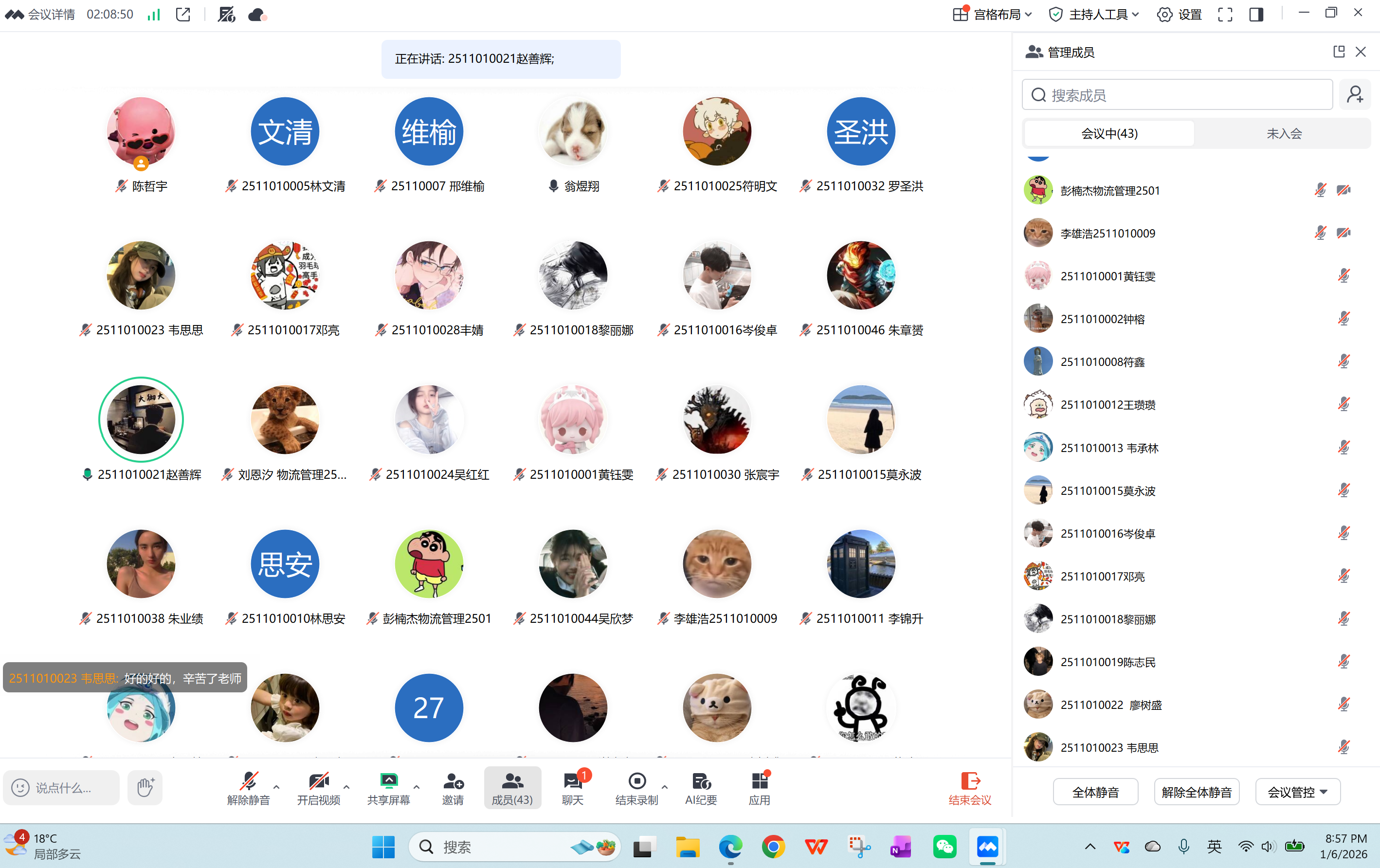 本次讲座由管理学院教师指导、助教陈哲宇协调组织,通过腾讯会议同步录制,方便未能到场的同学线上参与。互动环节中,同学们积极提问,就物流科技应用、职业路径选择、实习机会获取等问题与嘉宾进行了深入交流,现场气氛热烈。