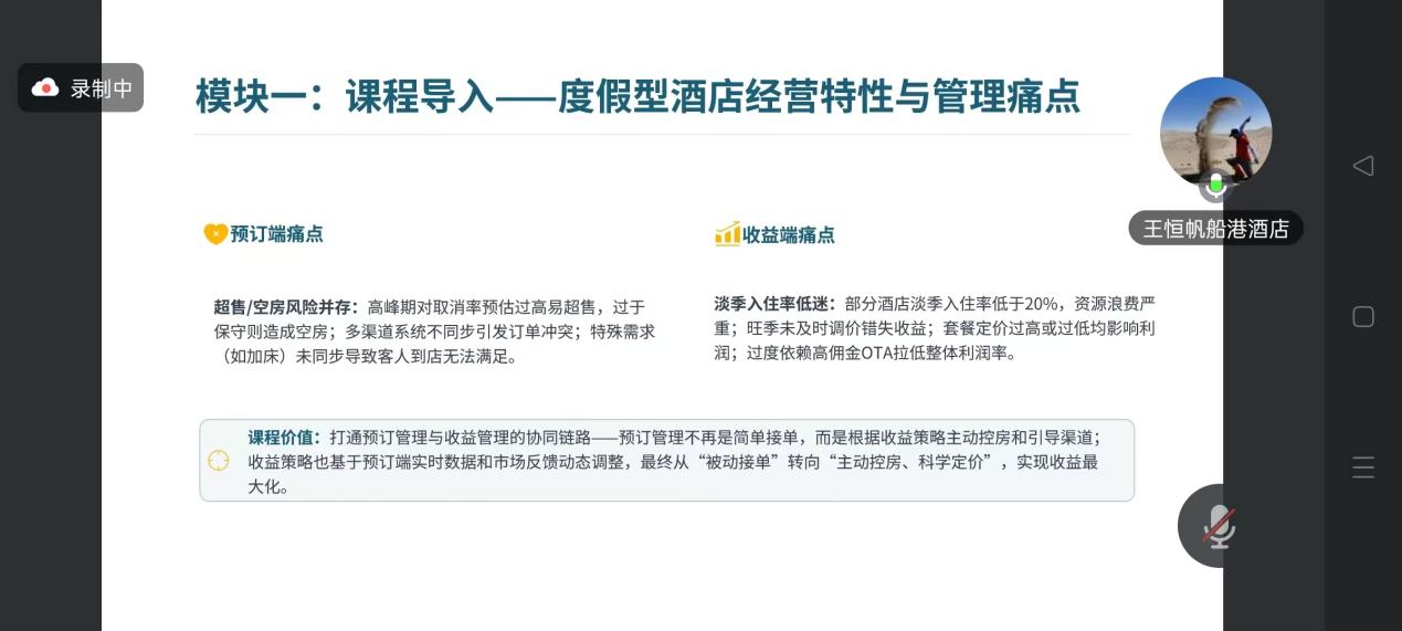 在核心内容分享环节,王恒总经理聚焦度假型酒店预订管理与收益管理展开深入讲解。先从度假型酒店经营特性与管理痛点出发、讲解了预订管理全流程精细化运营、收益管理核心逻辑与实战策略、预订与收益管理的协同联动机制,还结合实操案例,详解了动态定价策略的应用逻辑。
