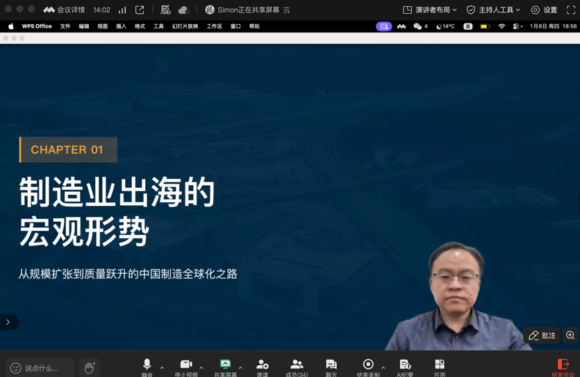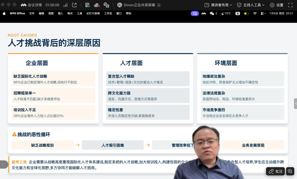 2026年1月8日,校外行业专家杨志学博士为2025级人力资源管理学生做了一场精彩的线上讲座。本次讲座围绕中国制造业出海背景下的人才培养挑战与机遇展开,为人力资源管理专业学生提供了关于行业发展趋势、人才需求及个人成长方向的全面指导。