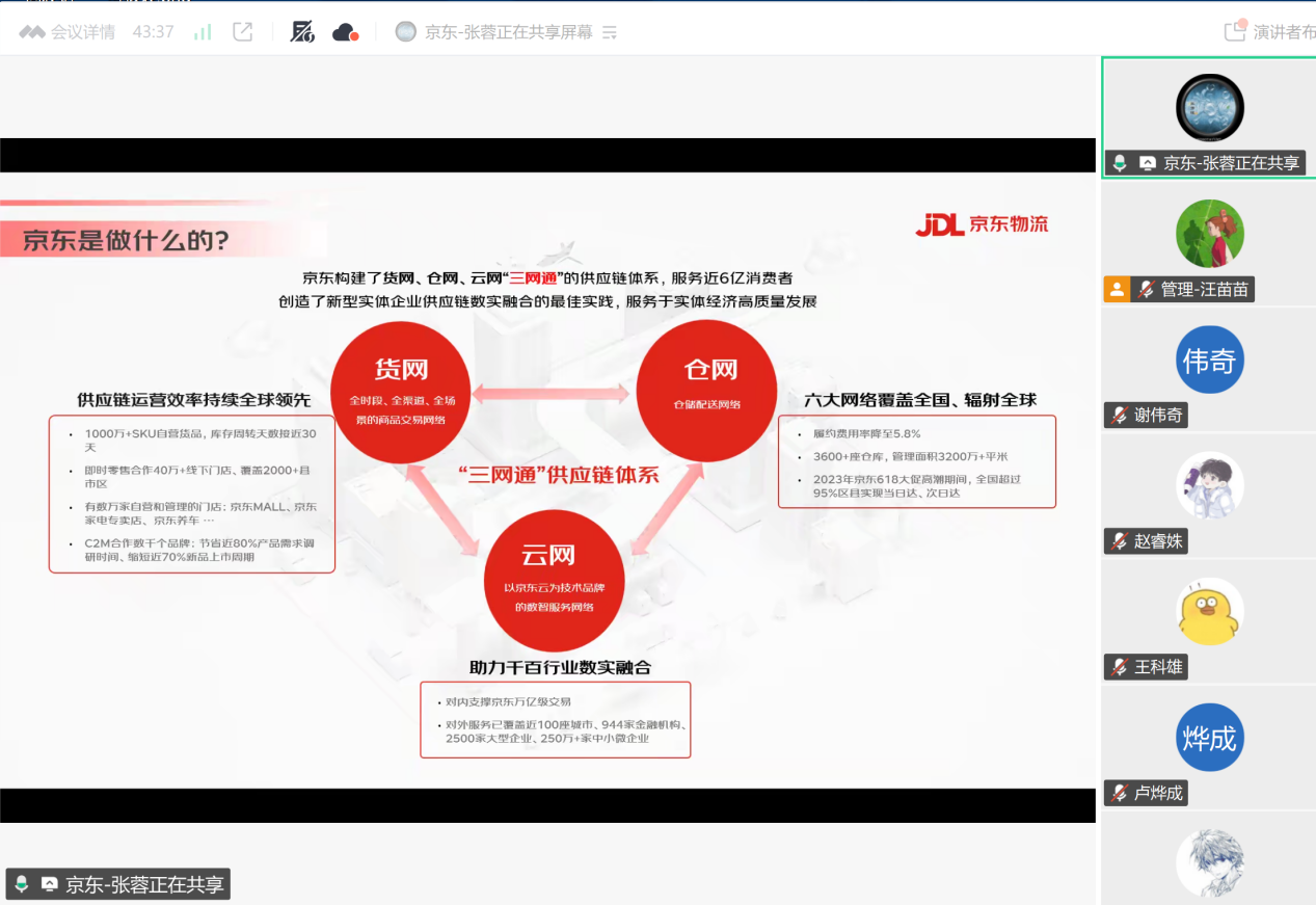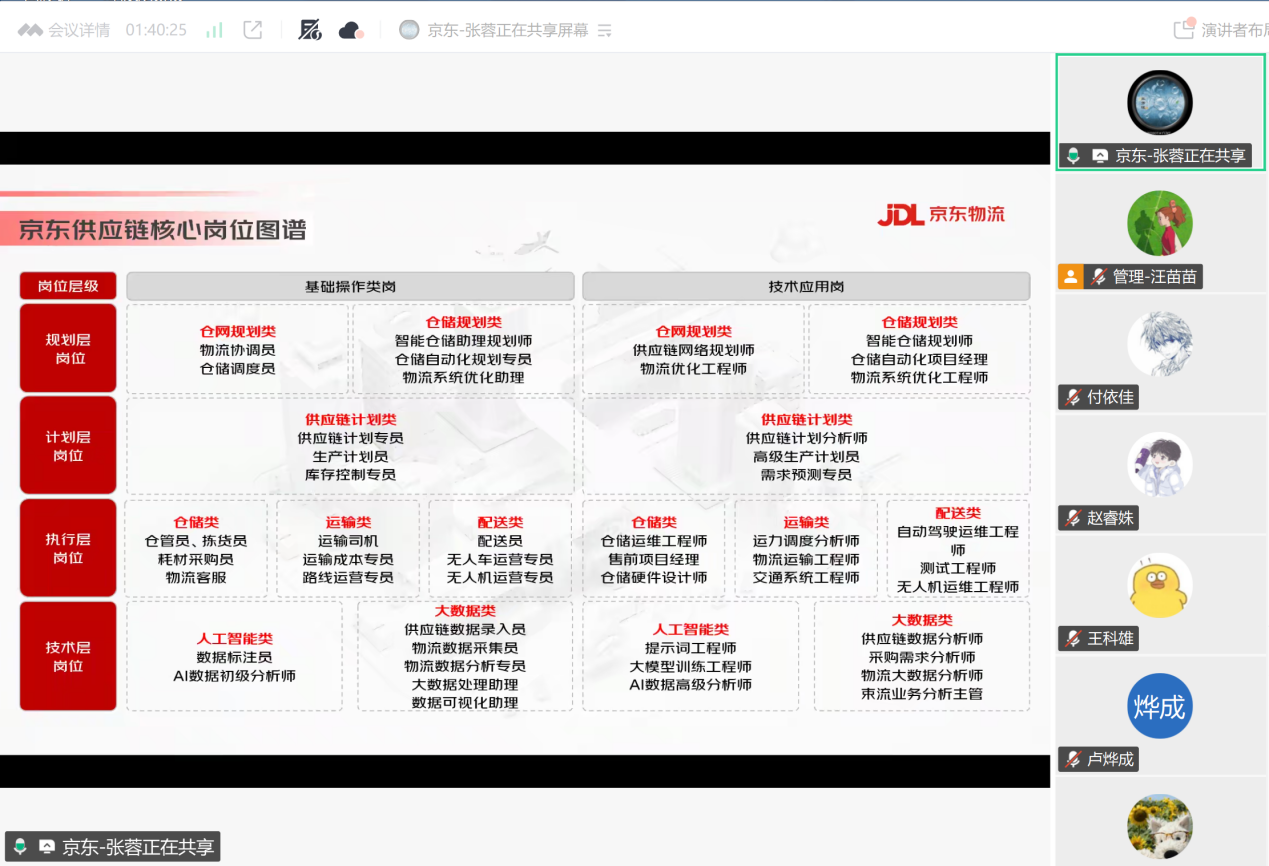 讲座中,张蓉总监结合京东物流在数智供应链领域的深耕实践,系统拆解了行业发展的核心逻辑。她指出,当前数智供应链正迎来万亿级市场机遇,2025年中国数字化供应链管理市场规模已突破3000亿美元,预计未来两年将保持年均20%的高速增长,人工智能、大数据、物联网、区块链等技术的深度融合,正推动行业向智能化、自动化、绿色化加速转型。张蓉总监从京东“三网通”供应链体系切入,系统介绍了京东如何通过“货网、仓网、云网”深度融合,构建起覆盖全国、辐射全球的高效供应链网络。同时结合京东物流“超脑”系统、“智狼”货到人系统等自研技术成果,生动展示了数字孪生如何实现仓储全流程智能化,AI算法如何优化路径规划与库存管理,让同学们直观感受技术赋能下“降本增效”的行业变革。