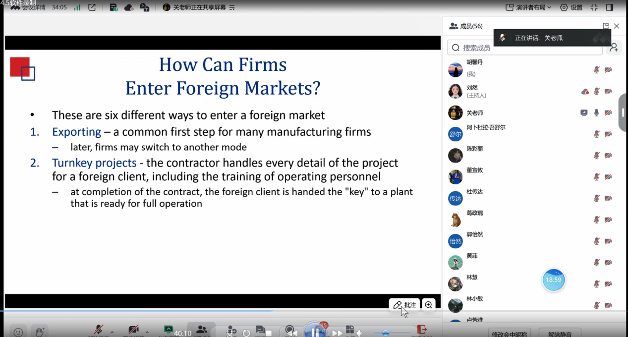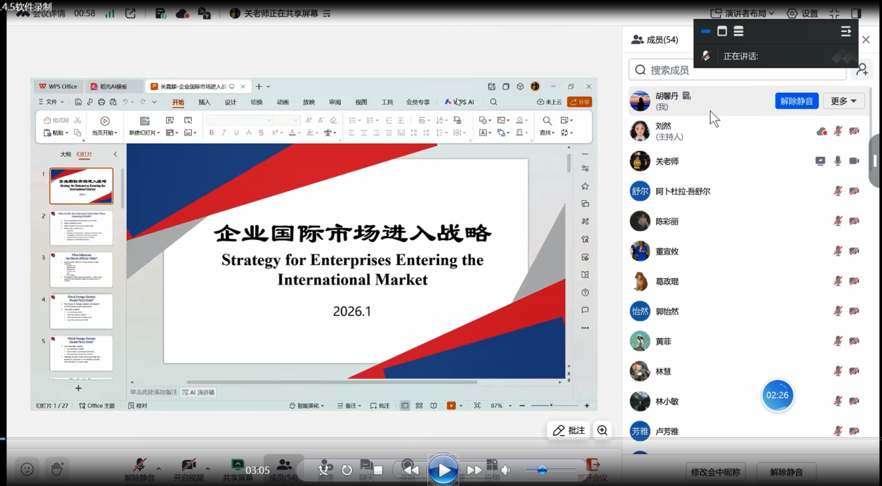 2026年1月9日,一场聚焦“企业国际市场进入战略”的线上专题讲座成功举办。本次讲座特邀外聘导师关教授授课,吸引了我校物流2401班的所有同学,旨在帮助学生深入了解企业国际市场进入战略,为以后进入企业工作提供理论知识。