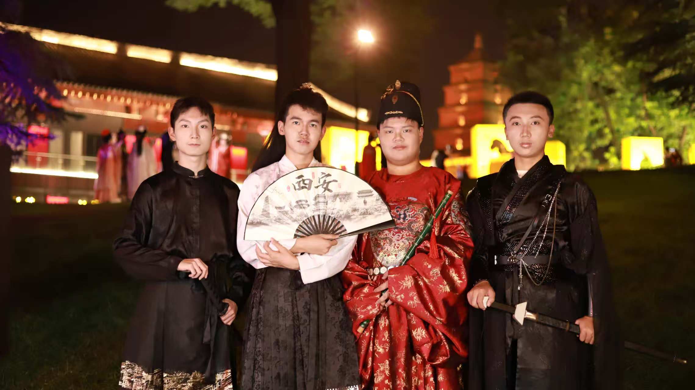 华灯初上的大唐不夜城,张峻瑀身着红金绣纹汉服,执扇漫步于红墙黛瓦间。唐风乐曲萦绕耳畔,不倒翁表演、琵琶弹奏轮番上演,身着各色汉服的行人穿梭其间,恍若穿越盛唐。“这一刻懂了‘长安归故里’的浪漫。” 作为学校文化浸润工程的受益者,他深知汉服是文化纽带,“学校常办传统文化活动,如今走出校园,我要做文化传播者,让更多人感受传统魅力。”