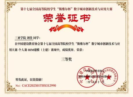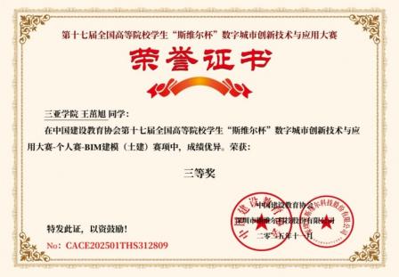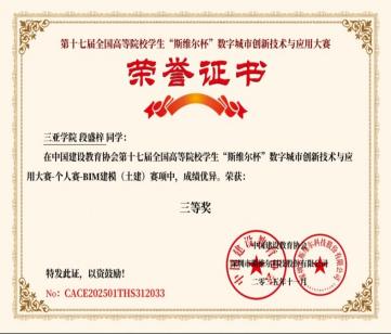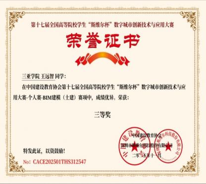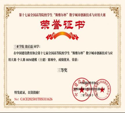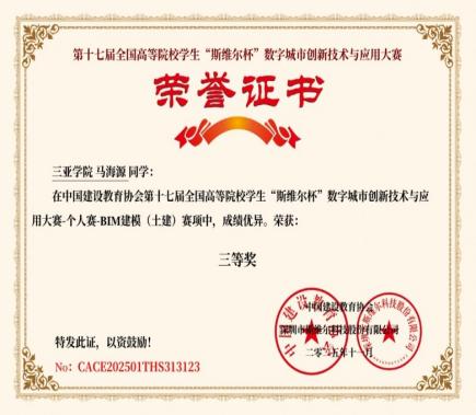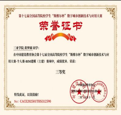 2025年11月,三亚学院管理学院专业型社团——BI协会在第十七届“斯维尔杯”全国大学生BIM创新设计大赛全国总决赛中表现亮眼,社团精心组织、积极备战,多名学子凭借扎实的专业功底、严谨的建模能力与出色的创新思维,在全国数千名选手中脱颖而出,荣获全国三等奖多项,为学校与学院再添荣誉,充分展现了管理学院学子过硬的专业素养与良好的竞技风貌。