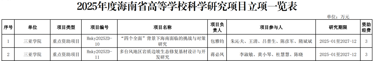 2025年,蒋必凤老师获海南省教育厅科学研究重点项目立项。在多台风地区,由于风雨荷载强度大,边坡稳定性较差,基材容易脱落,对边坡生态修复提出了更高要求。针对台风地区,如何修复岩质边坡,已成为一个重要的话题。工程管理专业蒋必凤老师一直致力于边坡生态修复领域研究,本次立项项目,蒋老师以多台风地区为例,针对岩质边坡的生态修复难点问题展开研究。课题将形成系列成果,丰富相关学科研究成果,为理论研究提供参考,同时为政府相关部门或工程企业提供岩质边坡生态修复提供参考,最终解决生态安全问题,具有较强的工程实践意义和社会意义。