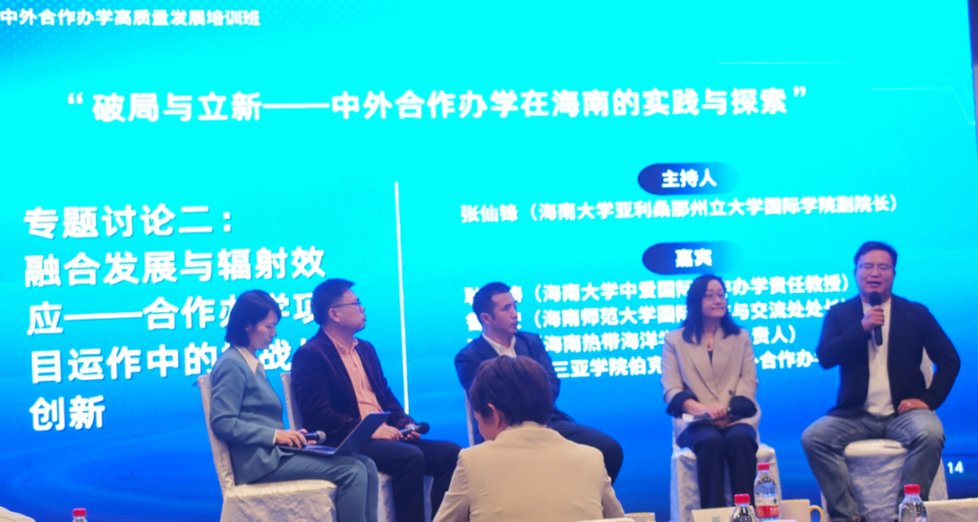 2026年1月23日至24日,由海南省教育厅主办的“海南省中外合作办学高质量发展培训班”顺利举行。我院国际经济与贸易(中外合作办学)教师侯永砥应邀参加培训,并在“破局与立新——中外合作办学在海南的实践与探索”主题讨论中担任发言嘉宾,围绕“融合发展与辐射效应——合作办学项目运作中的挑战与创新”展开深入交流。
