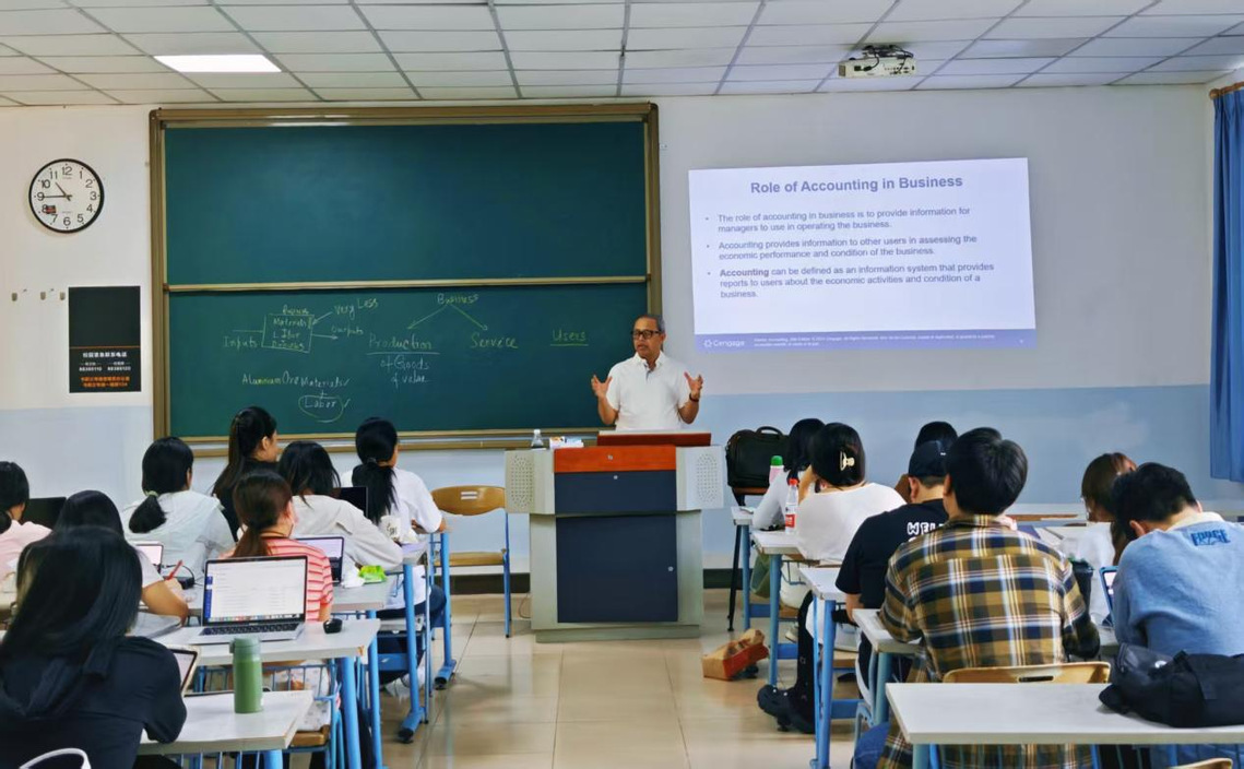 为进一步保障中外合作办学项目教学质量,美国伯克利学院代表李宏儒教授也深入课堂一线,随堂听取多门外教课程。他仔细观察教学过程,评估教学模式与质量,并与学生亲切交流,深入了解学生的听课效果与学习体验。听课结束后,李宏儒教授与学院领导详细交流国际经济与贸易(中外合作办学)项目的建设进展与人才培养成果。双方就进一步优化课程体系、强化师资互动、提升人才培养国际化水平等进行了深入探讨。